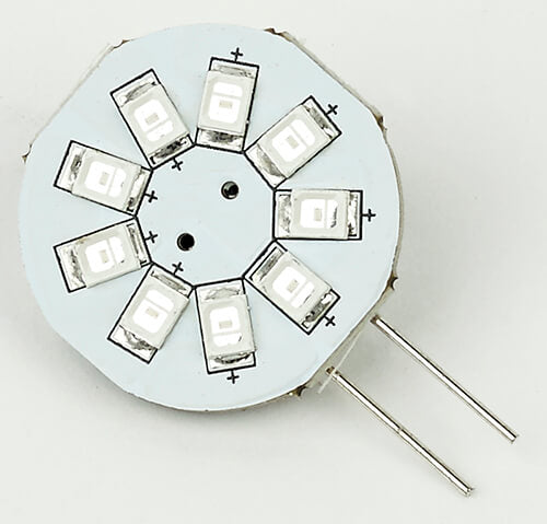 This is the "blue" LED version of one of our most popular replacement LED bulbs. The 9-LED SMD Power Cluster's compact design fits even the smallest side-pin G4 overhead fixtures common in today's modern boats. Illuminating side decks, aft cockpits and towers, the festive blue glow provided by these bulbs is becoming a popular choice for entertainment and other after-dark activities. Itsnine Surface Mount Device (SMD) LEDs and proprietary PWM Constant-Current chipset give it amazing performance for its form-factor.